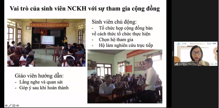 Assoc. Tran Thi Thu Ha (University of Agriculture and Forestry-Hue University) helped the participating scholars introduce the “development process-principles and methods of the Approach of Community-Based Participatory Research (CBR),” “Research ethics” and “implementing CBR for students with funding from outside the budget” through two presentations in the webinar.