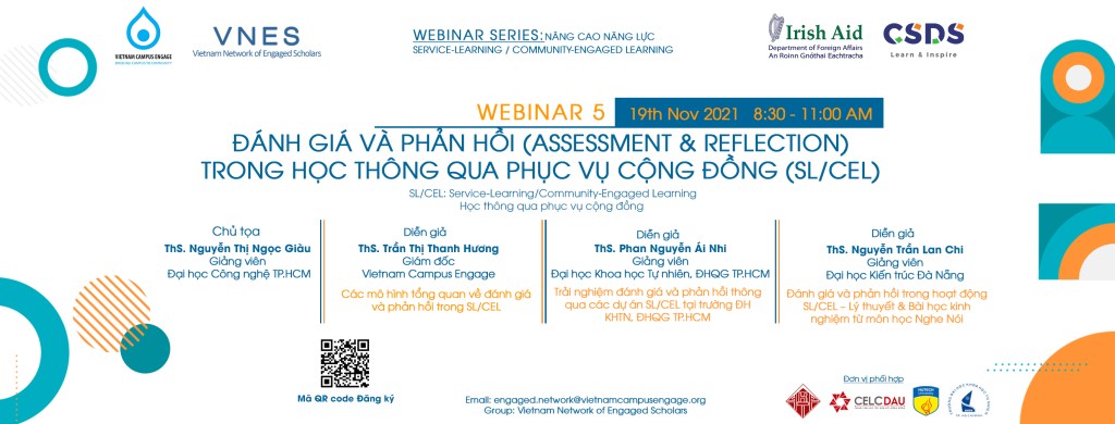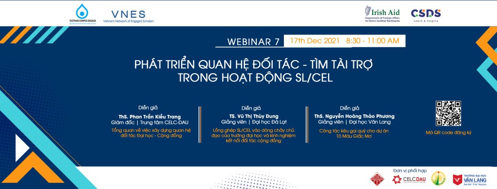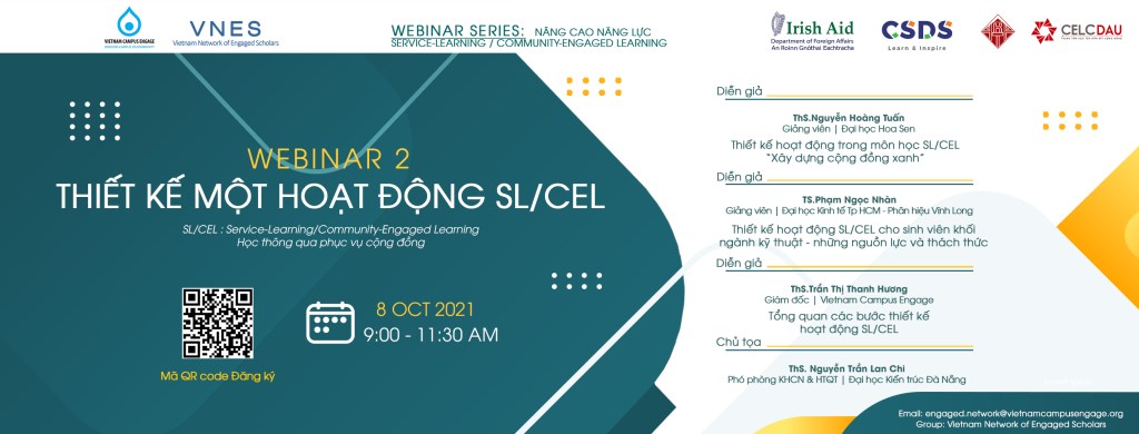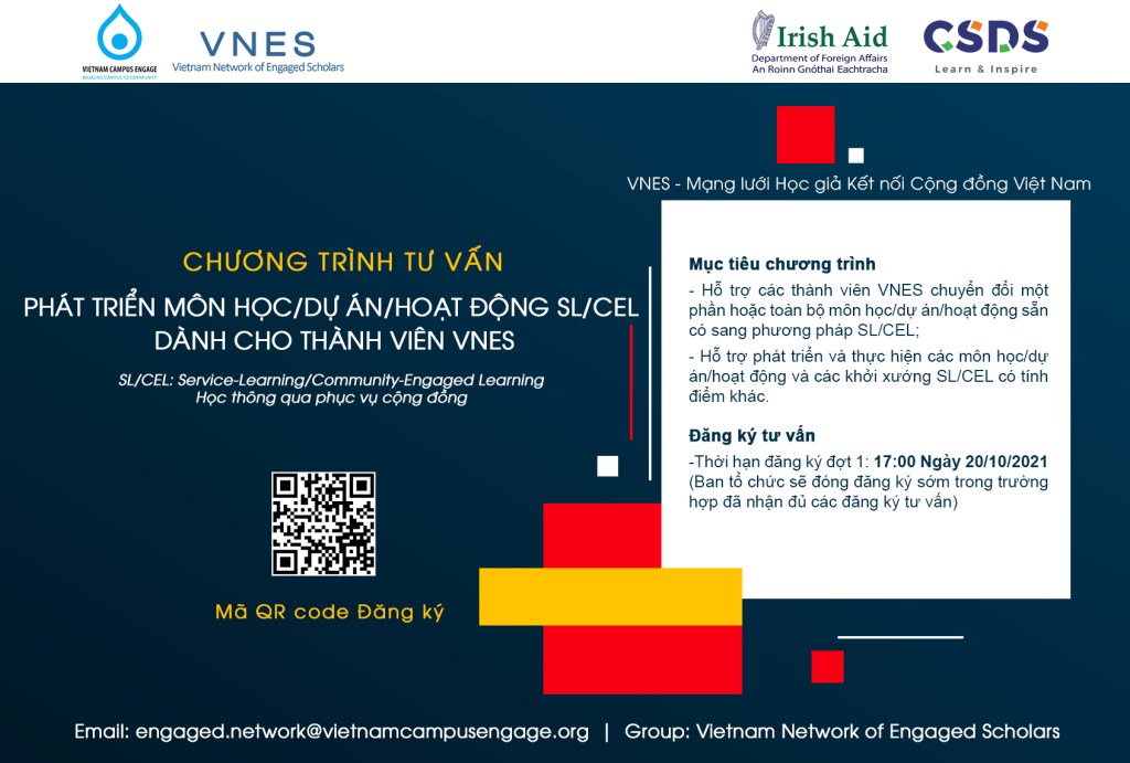 Chương trình tài trợ Phát triển môn học/dự án/hoạt động SL/CEL dành cho thành viên VNES – Mạng lưới Học giả Kết nối Cộng đồng Việt Nam do Trung tâm Hợp tác và Phát triển Giáo dục – (Vietnam Campus Engage) và Trung tâm Nghiên cứu Phát triển Bền vững (CSDS) điều phối dưới sự tài trợ của Quỹ Viện trợ Ireland (Irish AID).